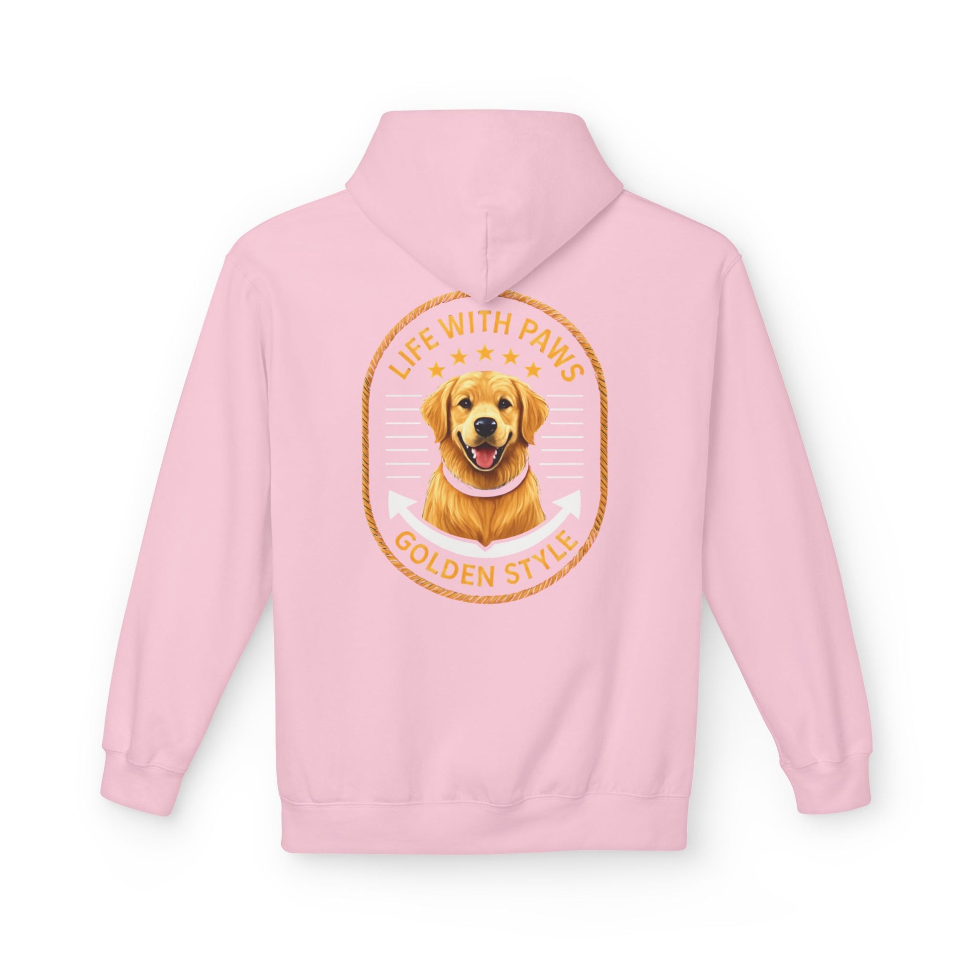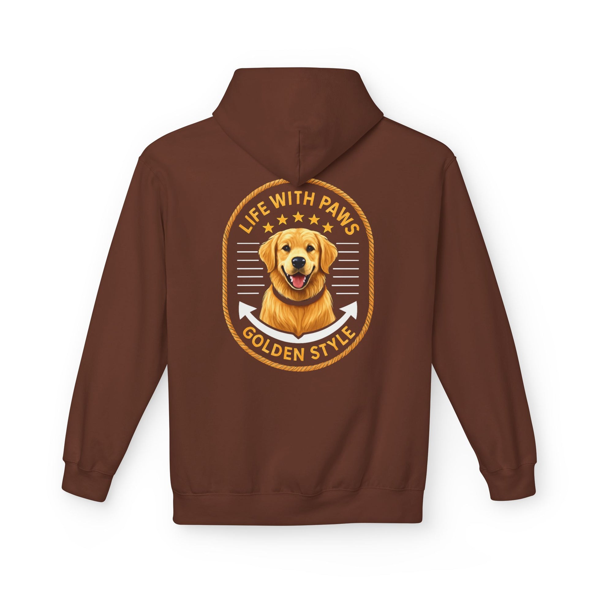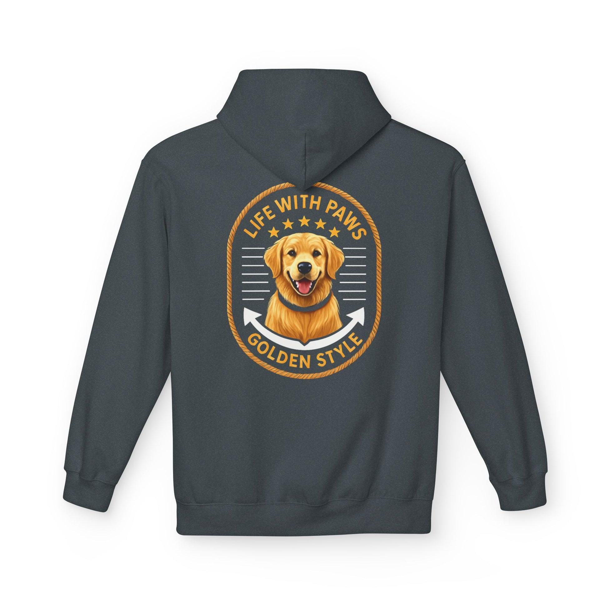 This hoodie is for people whose days are measured in golden tail wags and muddy paw prints. Lightweight enough for morning walks, but warm enough to curl up with your dog on the couch. The front graphic quietly signals you belong to Life With Paws community — a nod that sparks conversations with fellow golden retriever parents at the park or on neighborhood strolls. Soft on the skin, substantial in feel, it reads as lived-in comfort: the kind you reach for after a long day of fetch and cuddles. It holds up to repeat wear and washes while staying gentle on both people and the planet, so you can wear your connection to your pup and to that circle of dog lovers without compromise.